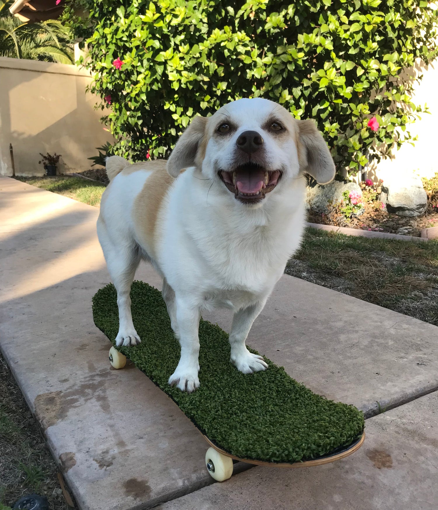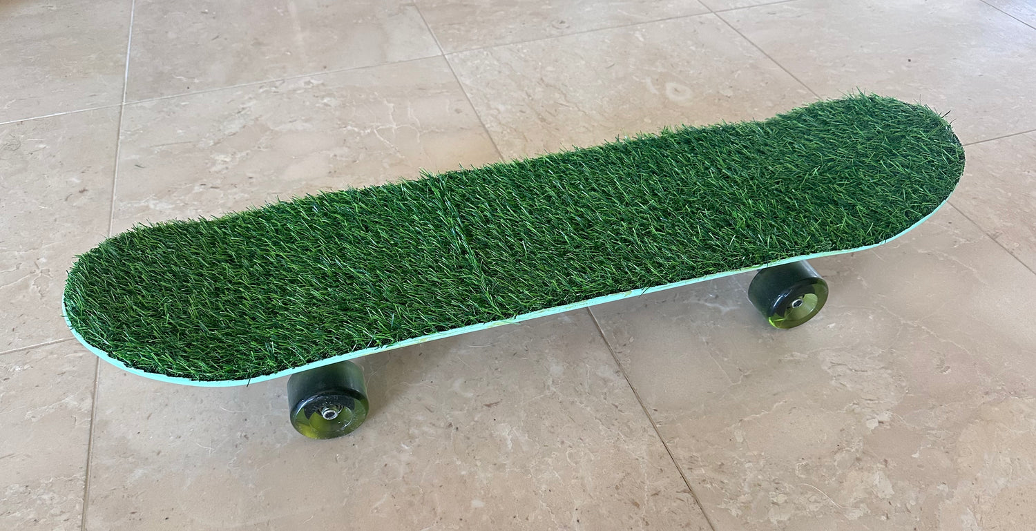 Skateboard deck is covered with artificial grass to form an unique feel and traction for both humans and dogs